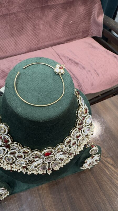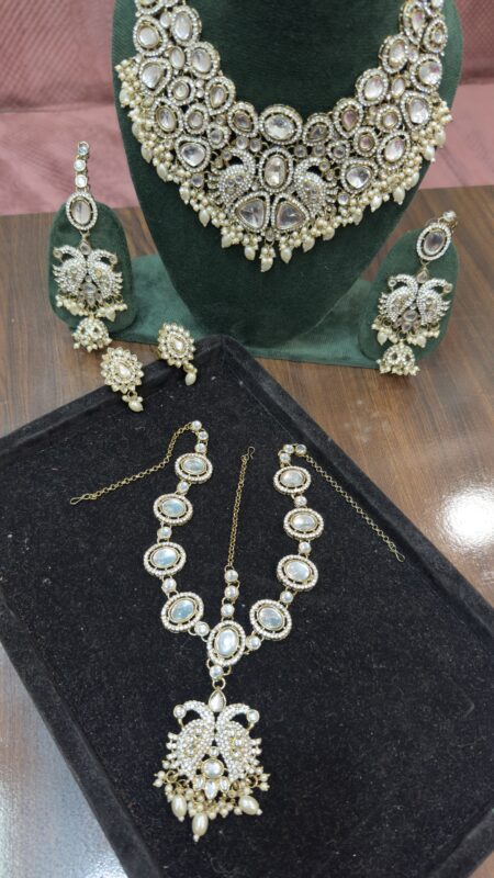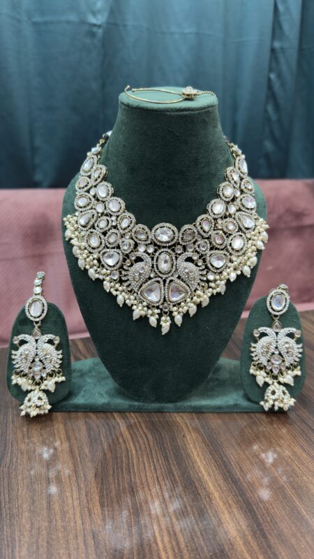 AD Designer Necklace Set Silver Golden With Nano Setting With Earrings and Mangtika