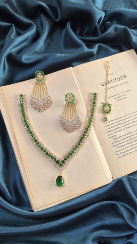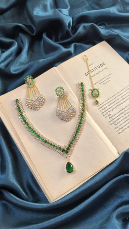 AD Golden Polish Necklace Set With Earrings and Mangtika – Green