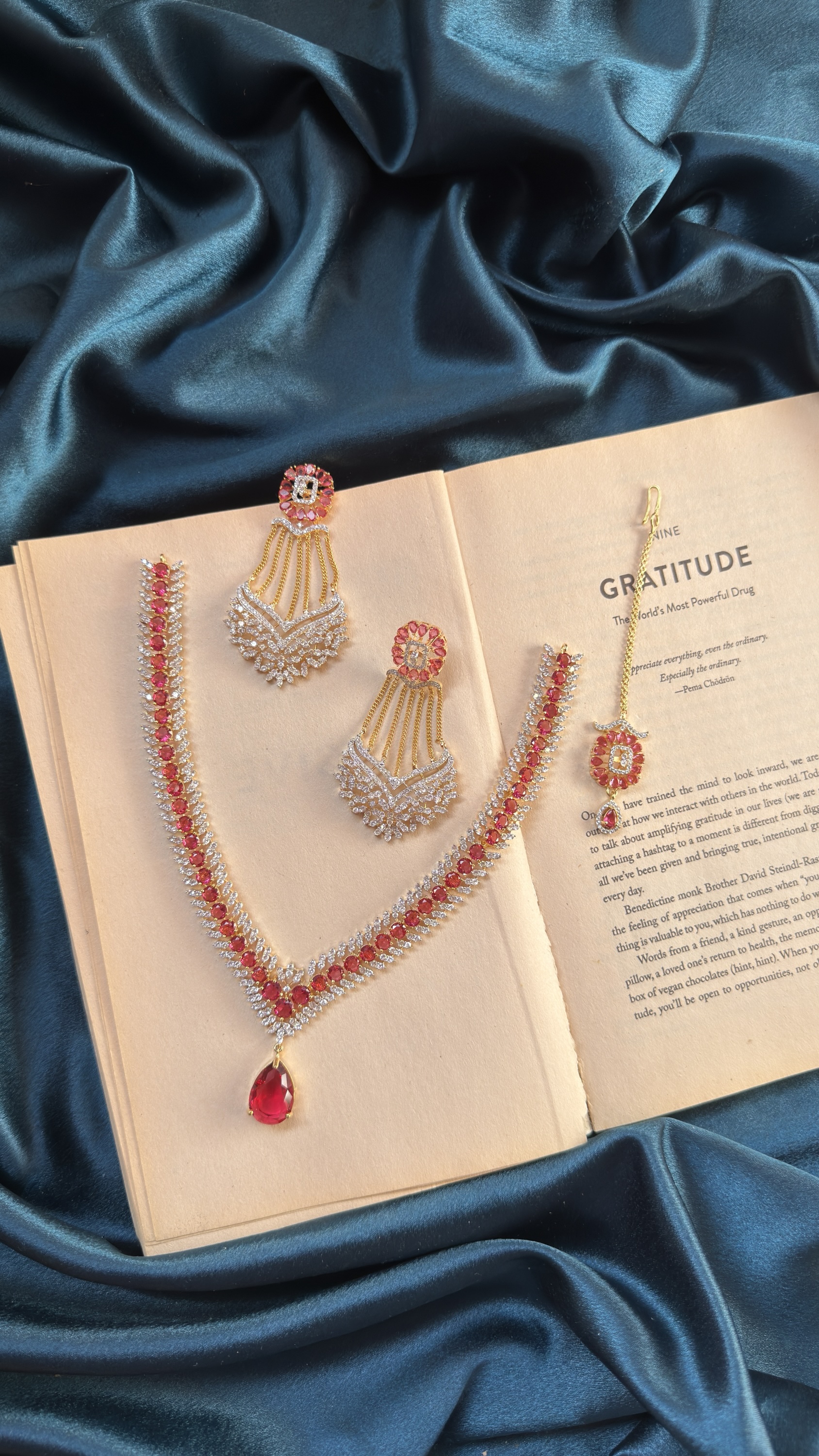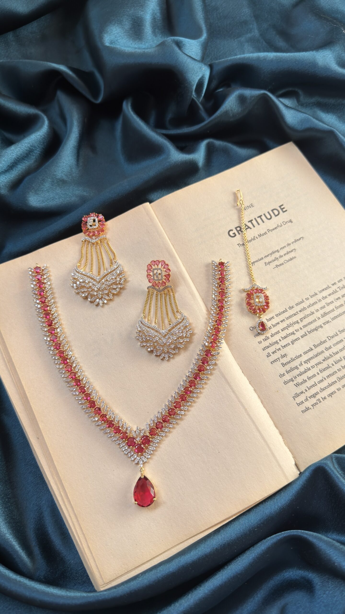AD Golden Polish Necklace Set With Earrings and Mangtika – Ruby