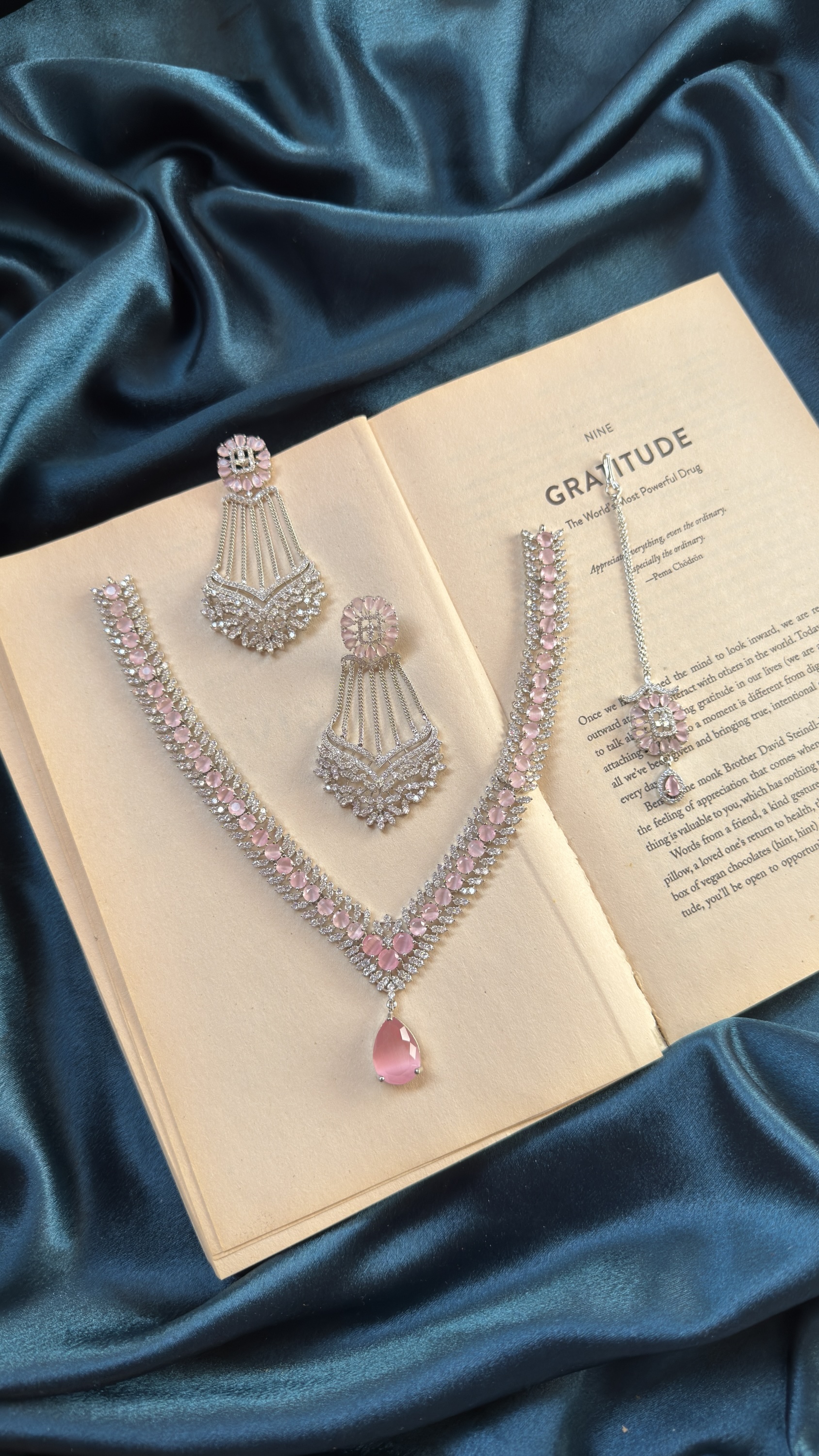 Baby Pink AD Necklace Set With Crystal Mala With Earrings