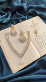 Home American Diamond and Polki AD Golden Polish Necklace Set With Earrings and Mangtika – Silver