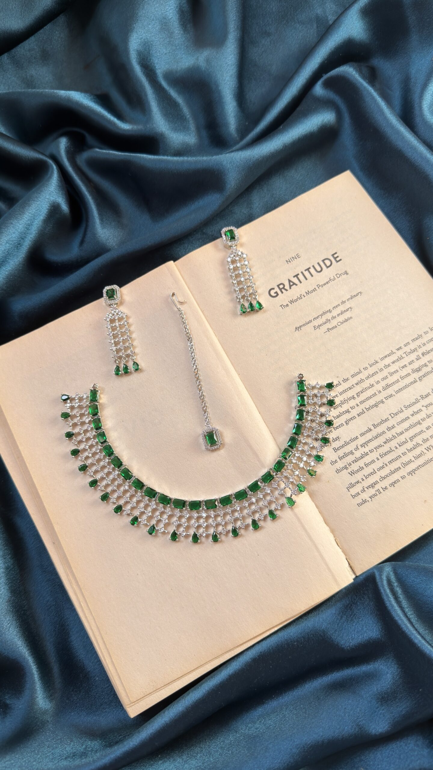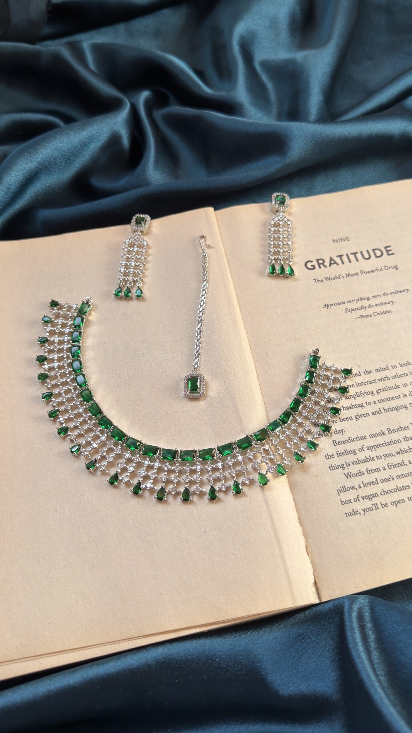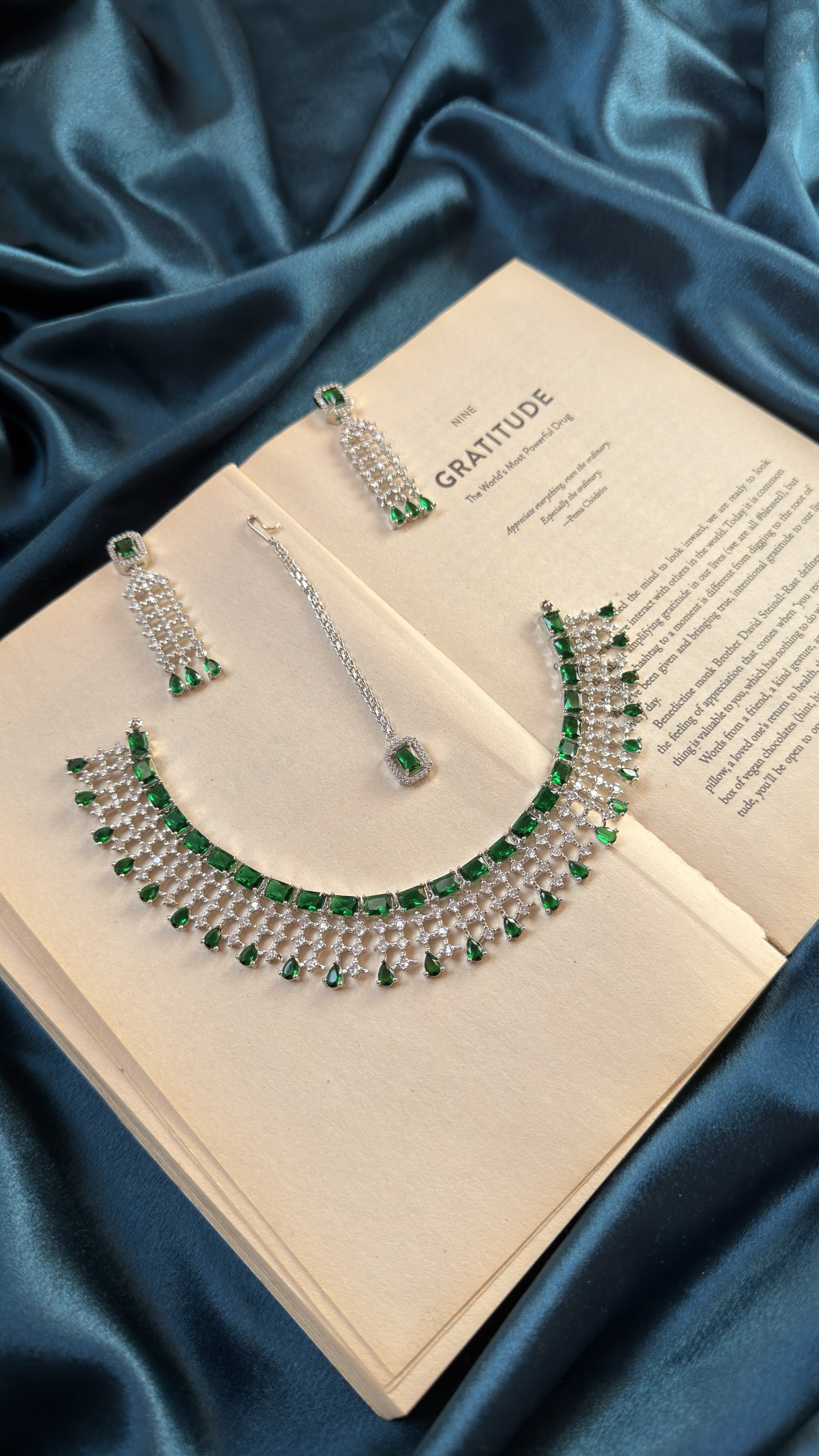 AD Necklace Set With Earrings and Mangtika – Green