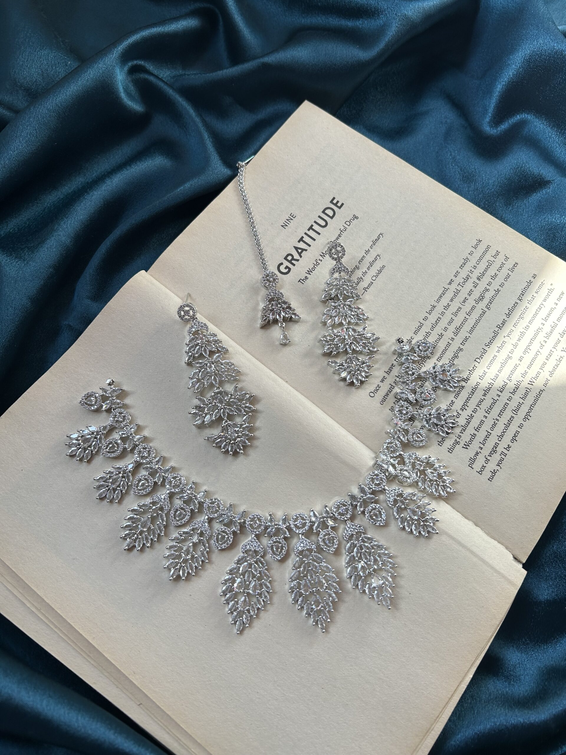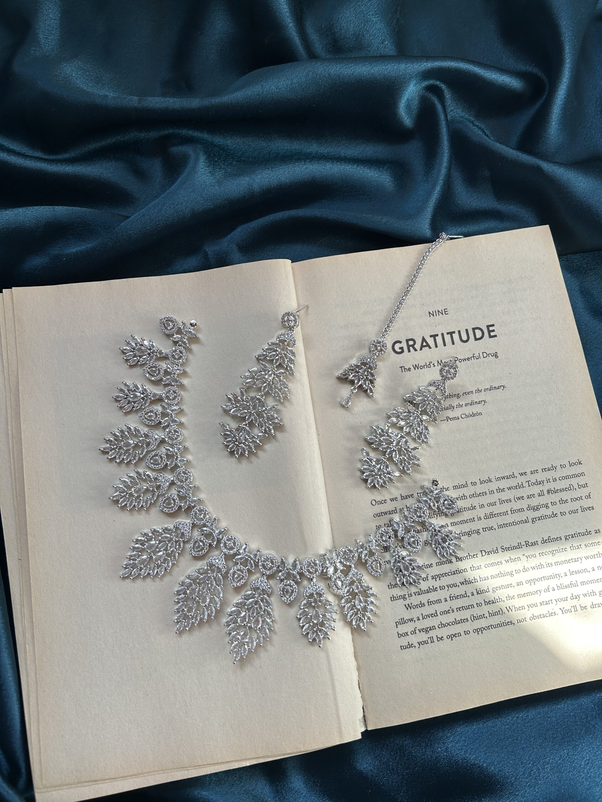 Home American Diamond and Polki AD Necklace Set With Earrings and Mangtika – Silver