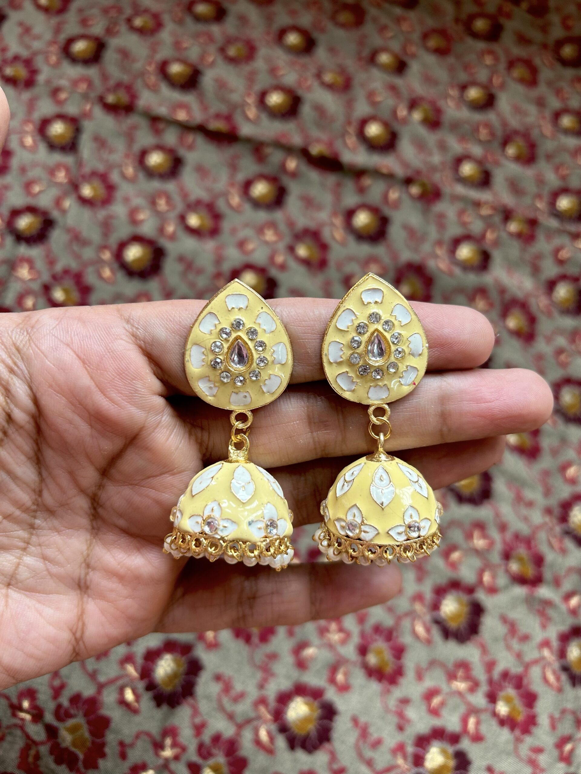 Meenakari Kundan Jhumkis with Pearls – Yellow