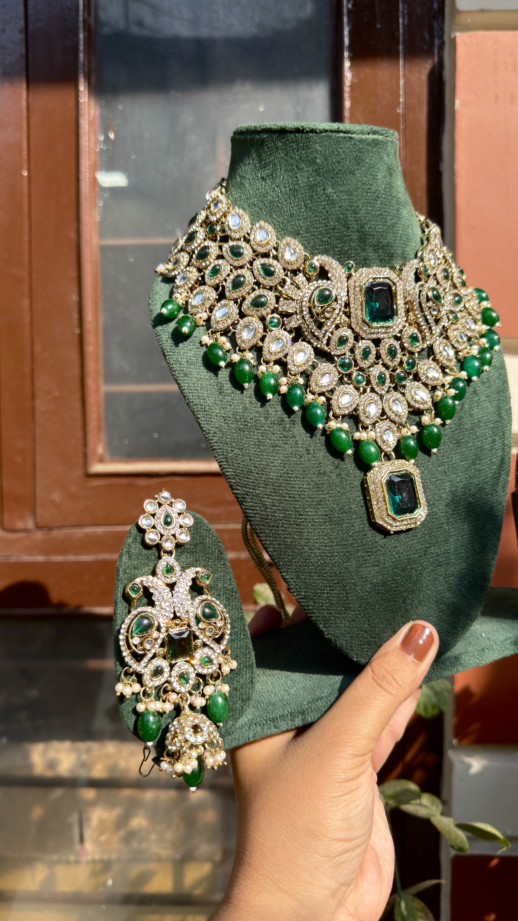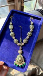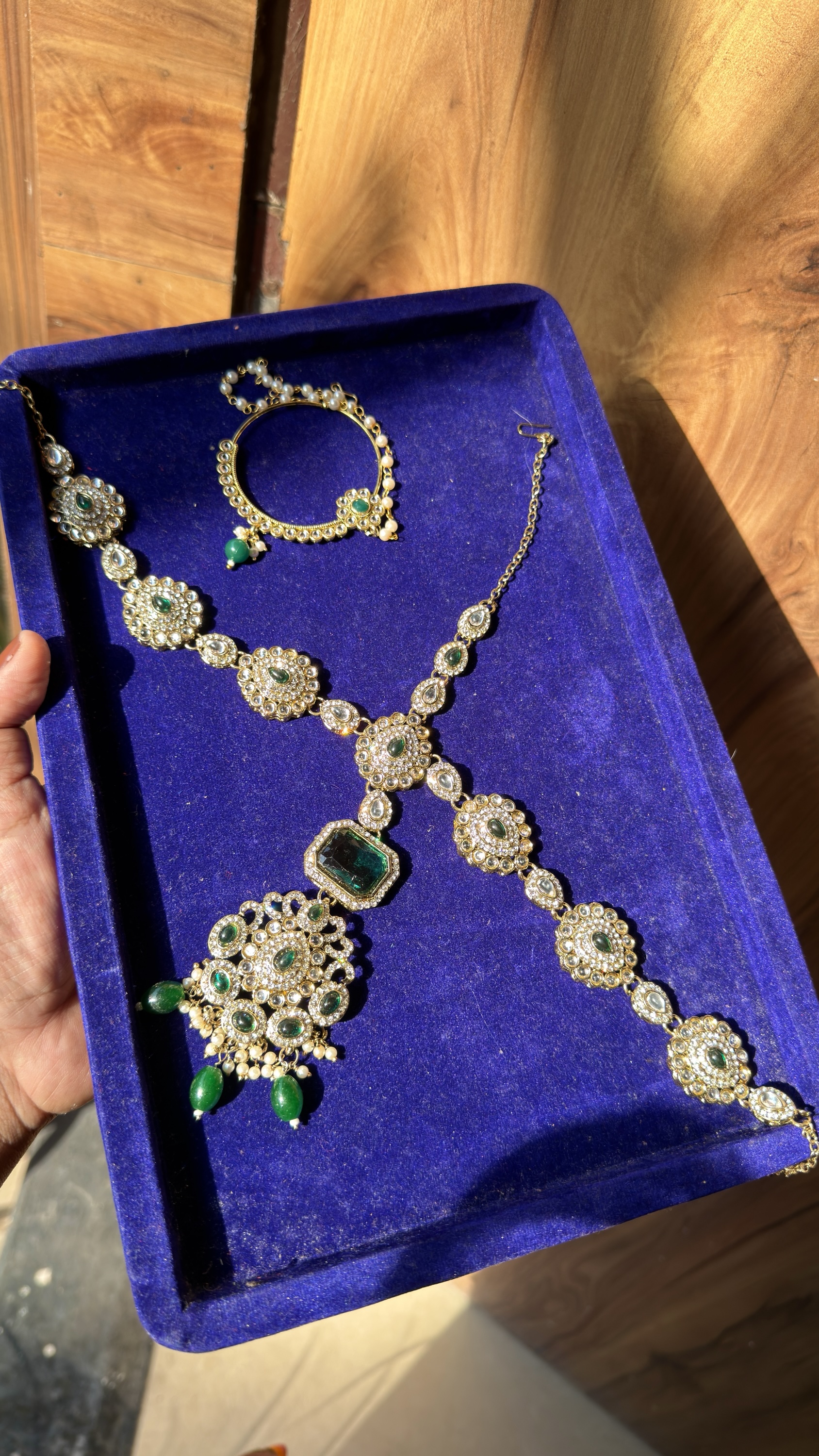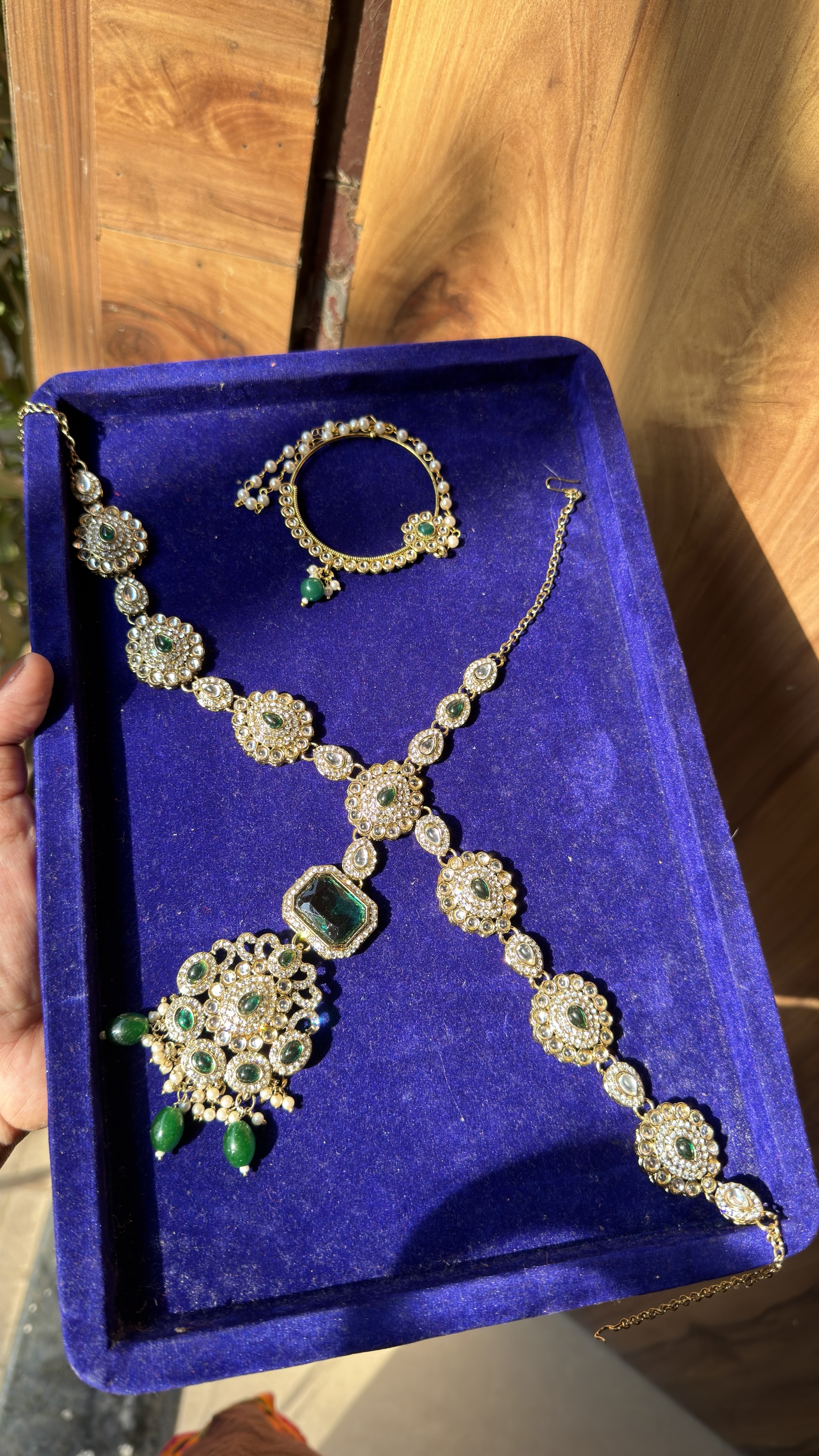 1. This Green  Colour Jewellery Consist of Necklace , Pair of Earrings , Seeshpatti With Mangtika, 2 rings and  Nath