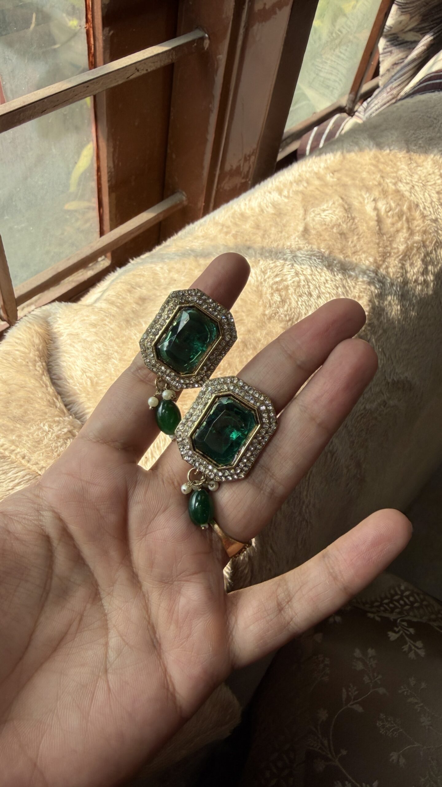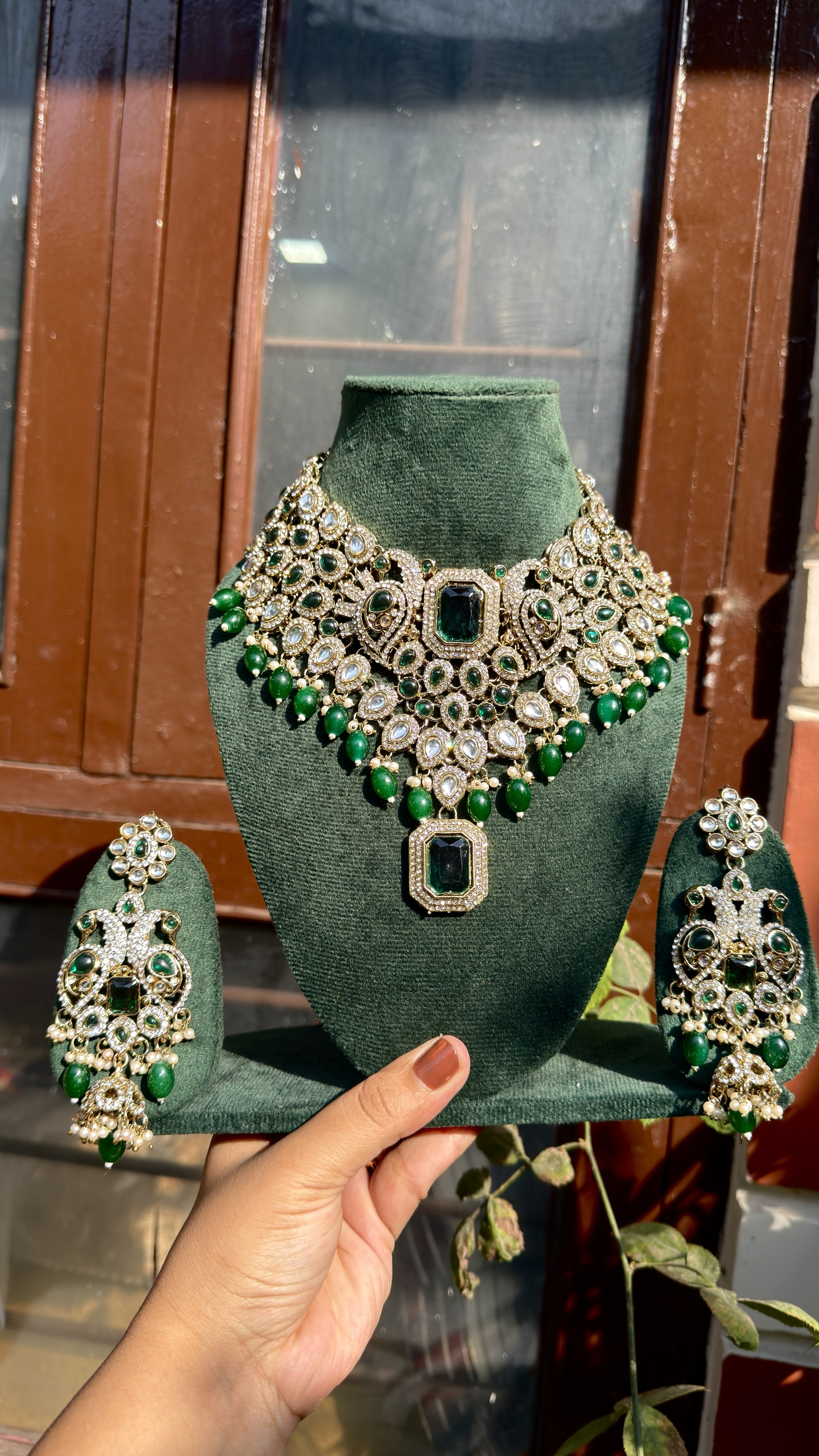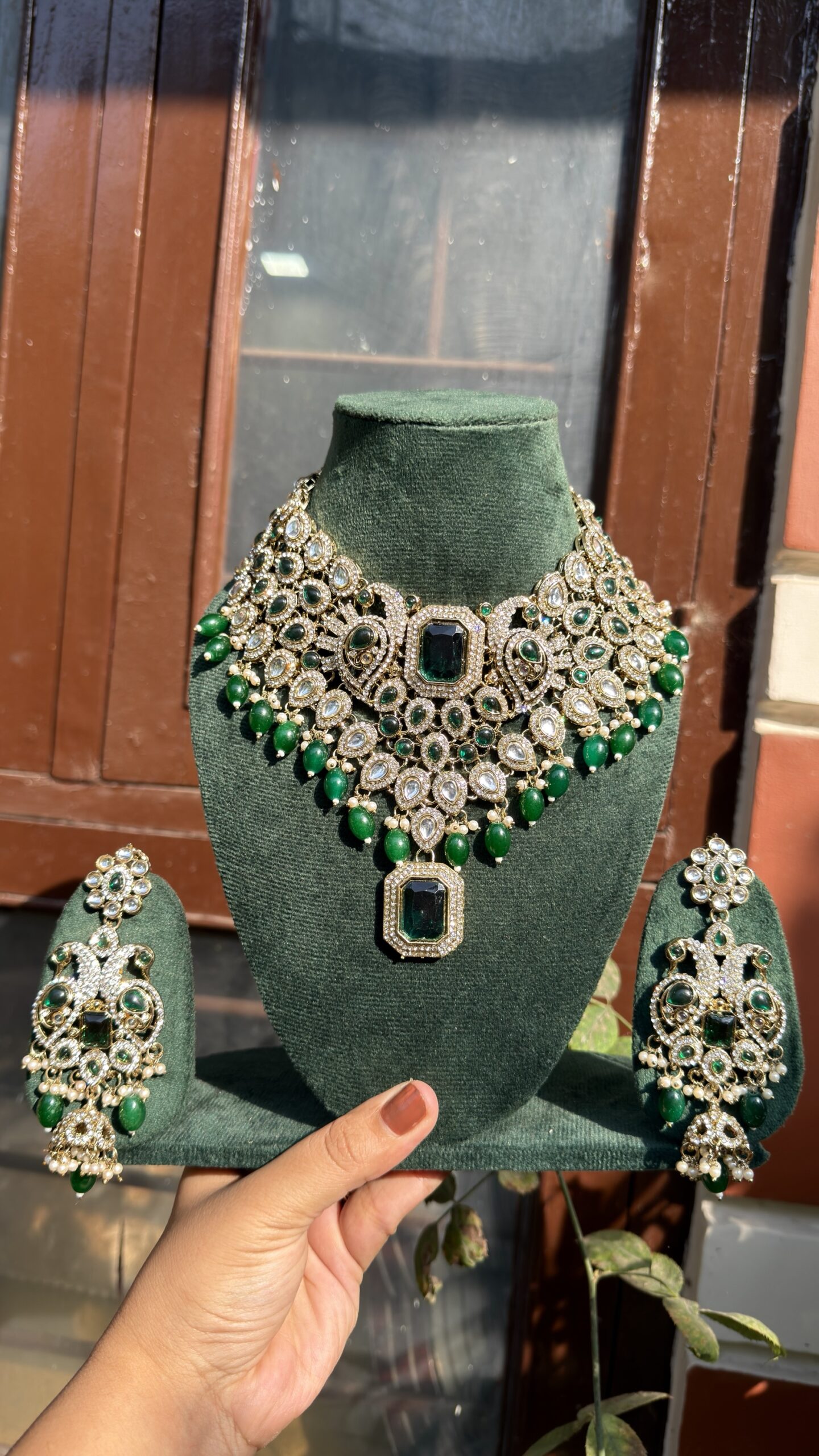 1. This Green  Colour Jewellery Consist of Necklace , Pair of Earrings , Seeshpatti With Mangtika, 2 rings and  Nath