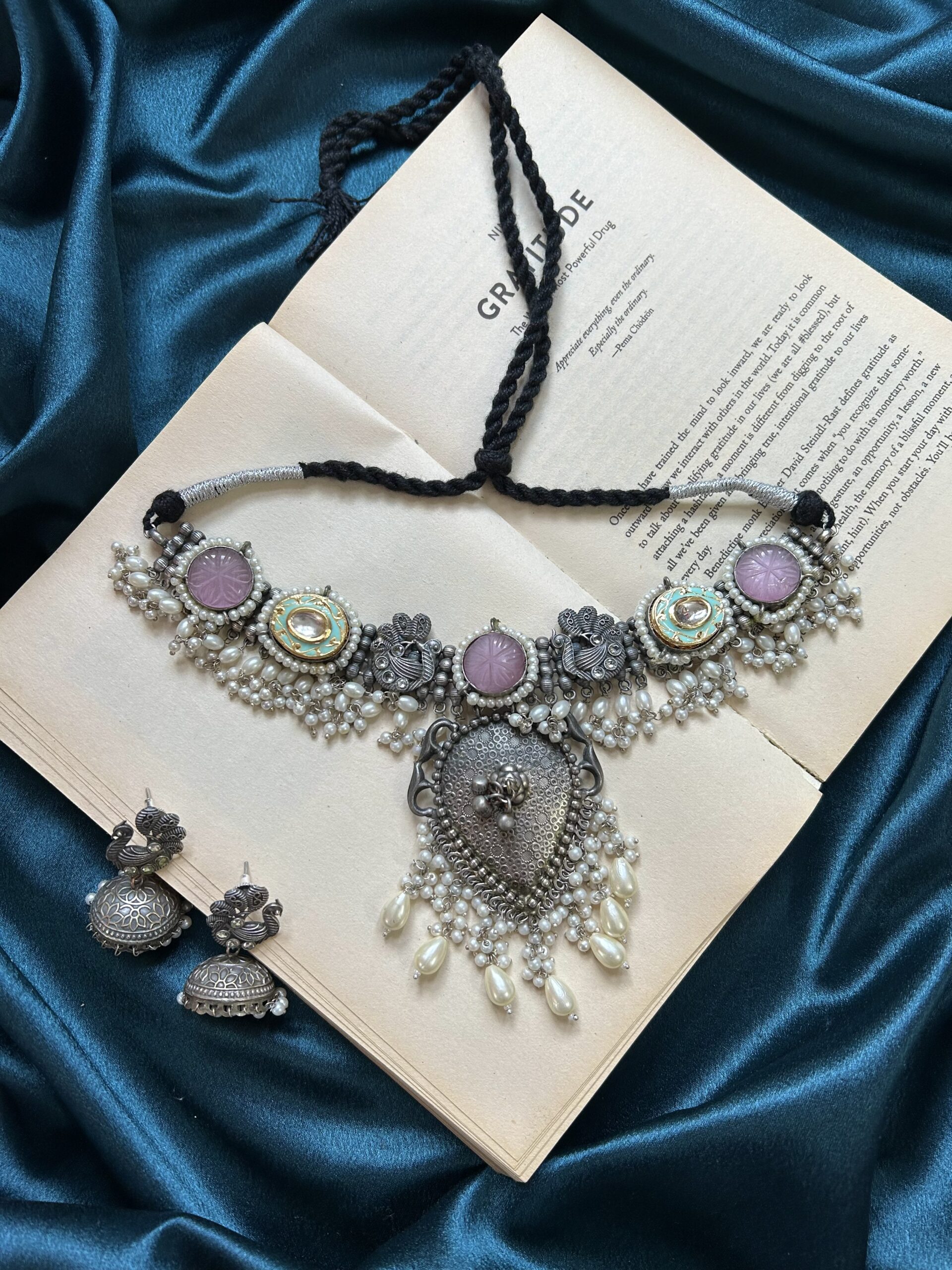 Oxidise Choker Set With Peacock Hanging – Pink & Blue